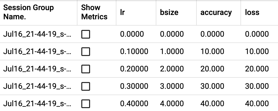from torch.utils.tensorboard import SummaryWriter with SummaryWriter() as w: for i in range(5): w.add_hparams({'lr': 0.1*i, 'bsize': i}, {'hparam/accuracy': 10*i, 'hparam/loss': 10*i})
