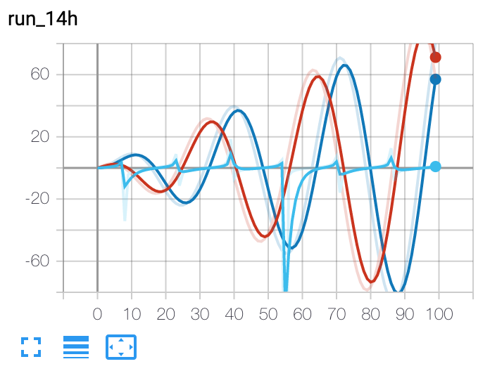 from torch.utils.tensorboard import SummaryWriter writer = SummaryWriter() r = 5 for i in range(100): writer.add_scalars('run_14h', {'xsinx':i*np.sin(i/r), 'xcosx':i*np.cos(i/r), 'tanx': np.tan(i/r)}, i) writer.close() # This call adds three values to the same scalar plot with the tag # 'run_14h' in TensorBoard's scalar section.